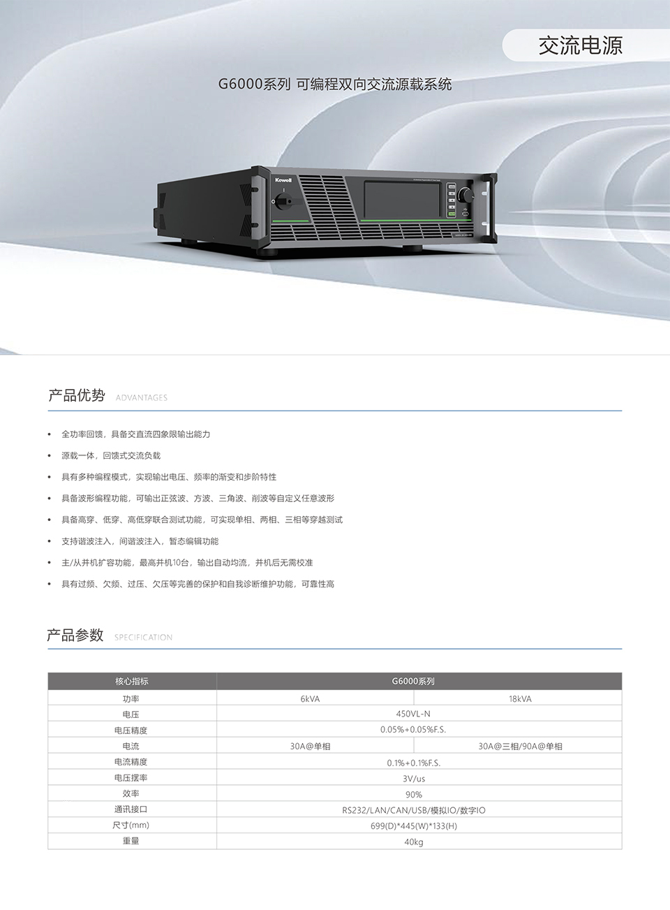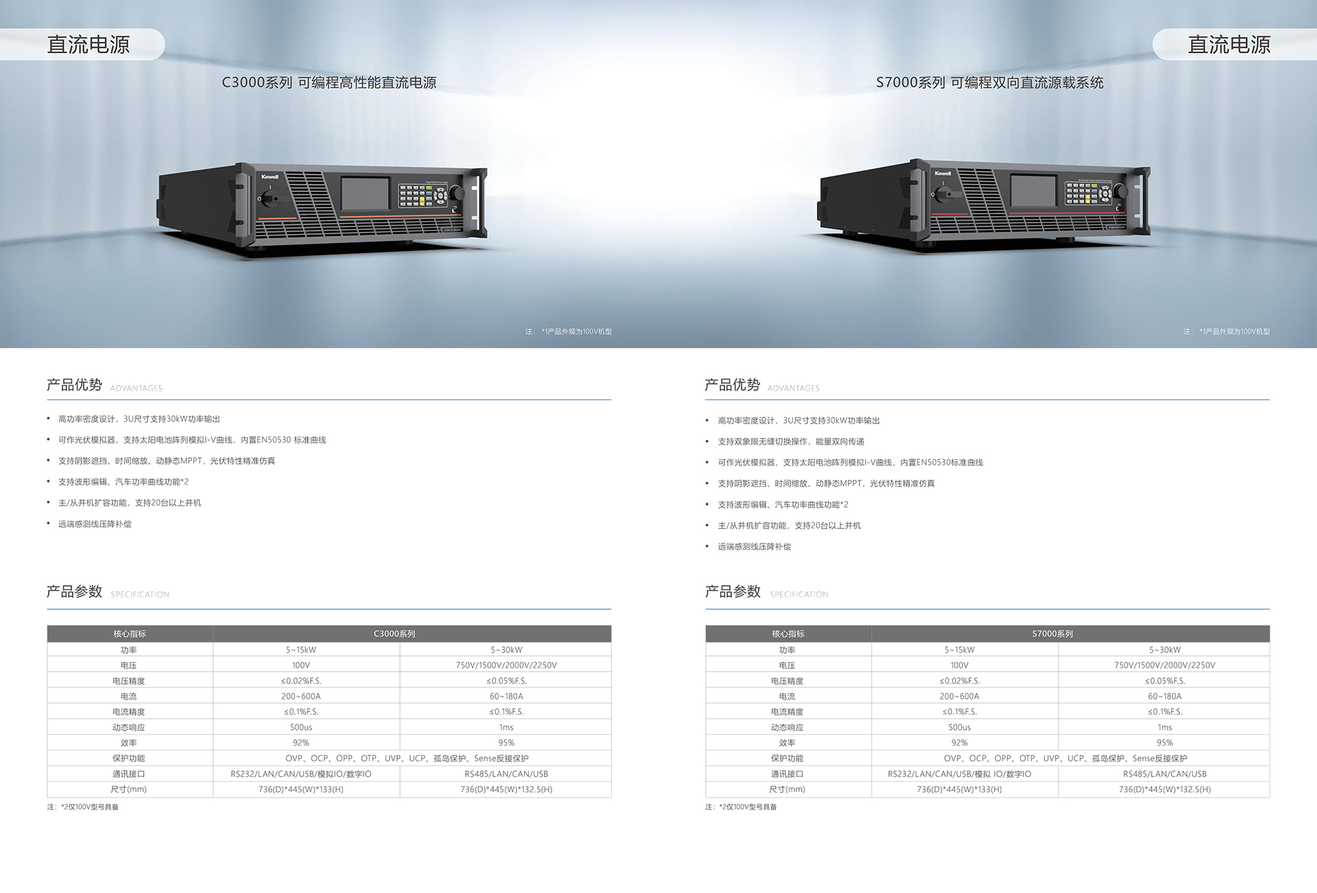 应对集中式逆变器日益增长的测试需求,太阳成tyc33455ccwww推出集高功率密度、高效率、高动态响应于一体的测试设备;直流侧支持太阳电池阵列模拟I-V曲线、光伏特性精准仿真等功能,内置EN50530、Sandia等多种法规模型;交流侧支持三相不平衡、谐波叠加等电能质量测试、模拟高低电压故障穿越测试工况等,简化测试平台,节约成本。