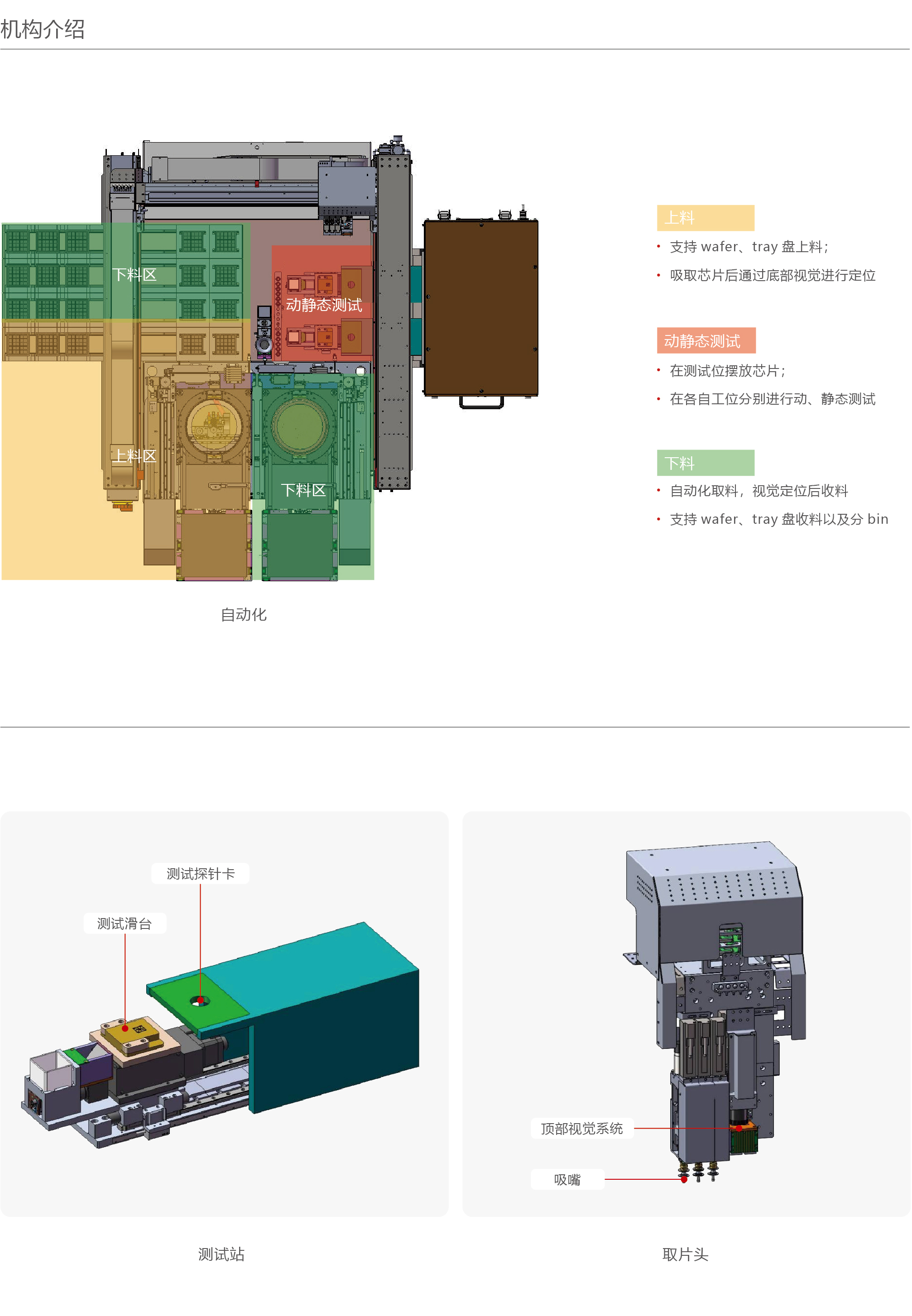 • 测试类型全覆盖,可根据客户需求进行测试功能的配置,实现芯片的外观检测、高温或常温下动静态测试等;