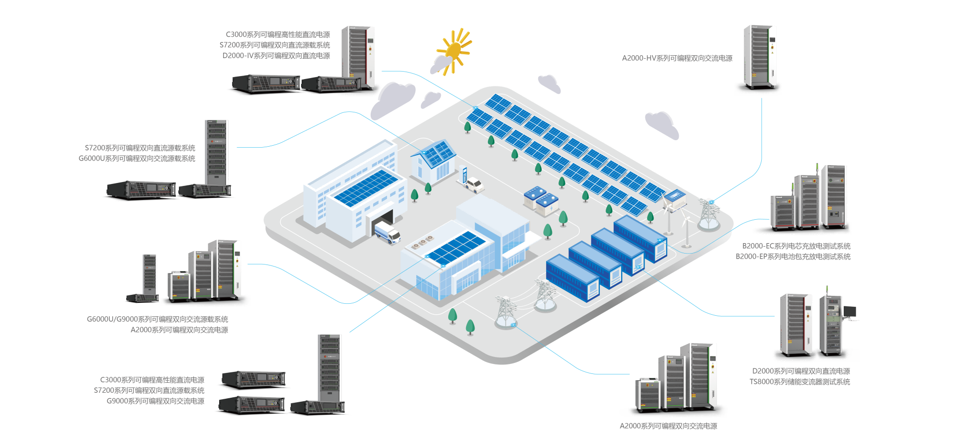 太阳成tyc33455ccwww光伏测试解决方案支持逆变器发电及并网全天候全场景模拟,匹配大功率/超高压的测试电源模拟大型光伏方阵及电压级别较高的电网端,为光伏客户/测试机构提供专业测试方案。
