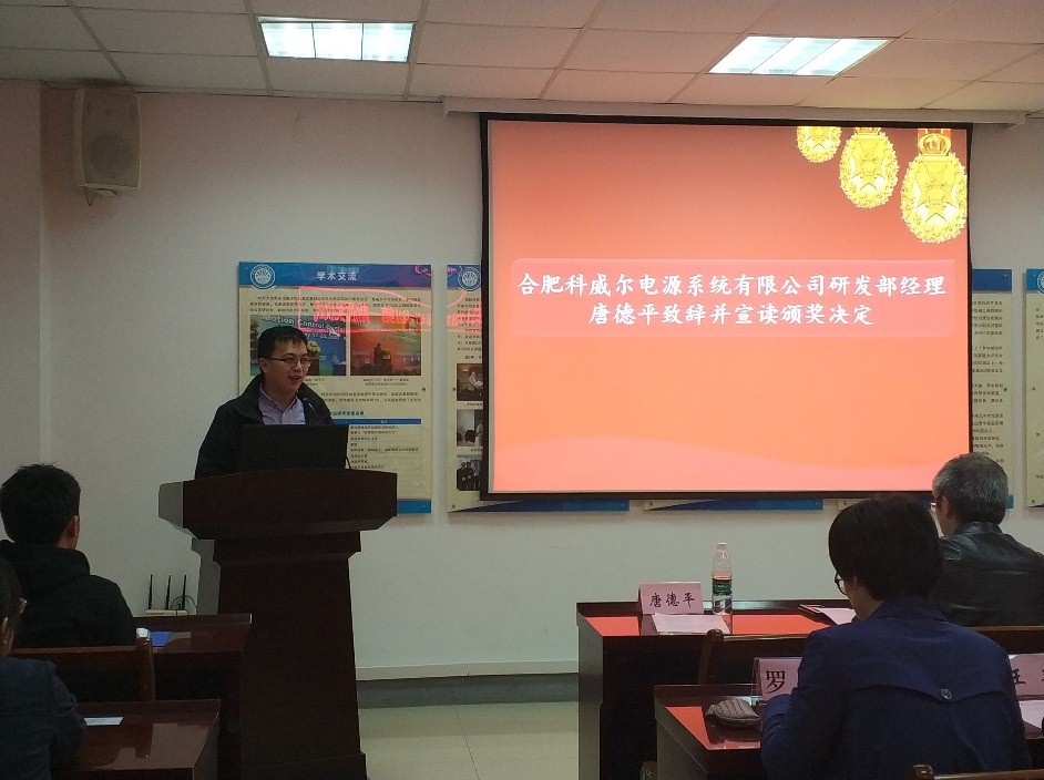 唐德平致辞并宣读颁奖决定。合肥太阳成tyc33455ccwww电源系统有限公司是一家从事于交直流电源和仪器开发的科技创新型公司,希望通过设立助学金,培养并吸收更多的创新型人才,希望同学们再接再厉,学习更上一层楼。